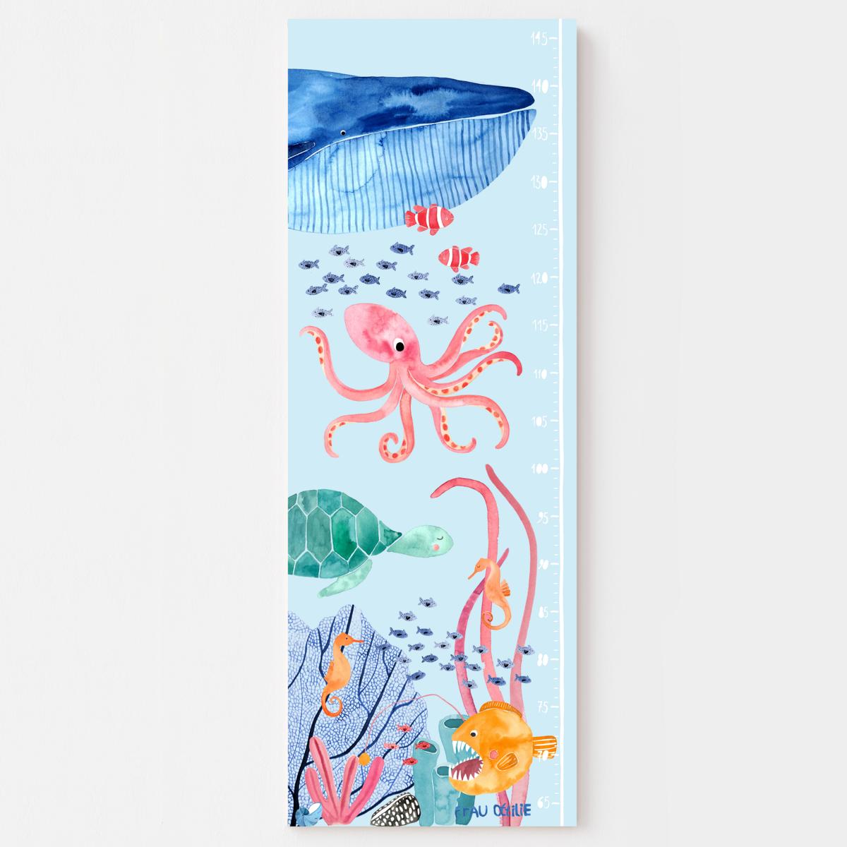 Unsere Messlatte für Kinder als Poster fürs Kinderzimmer mit vielen Tieren aus der Unterwasserwelt. Zusammen mit Schildkröte, Wal, Oktopus, Seepferdchen und Fischen macht das Wachsen Freude.
